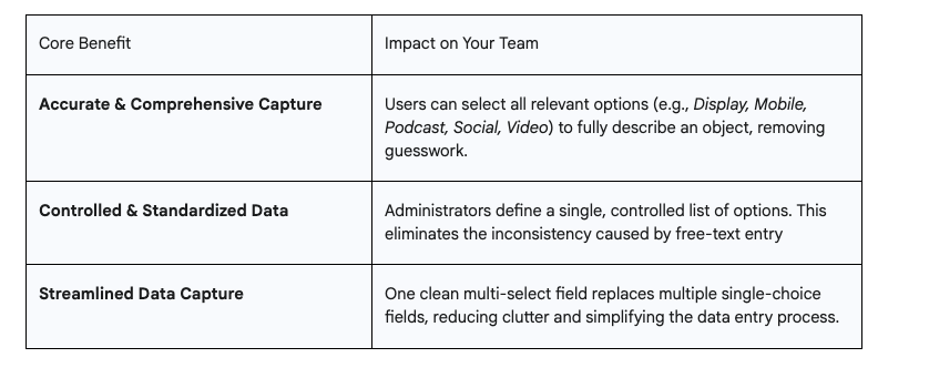 Tired of forcing complex, real-world data into a rigid single-selection box? You know the feeling: an account is active in four different media channels, but your CRM/OMS only lets you choose one. The result is a broken system: either you resort to messy, unstructured free-text fields, or you just capture half the story.